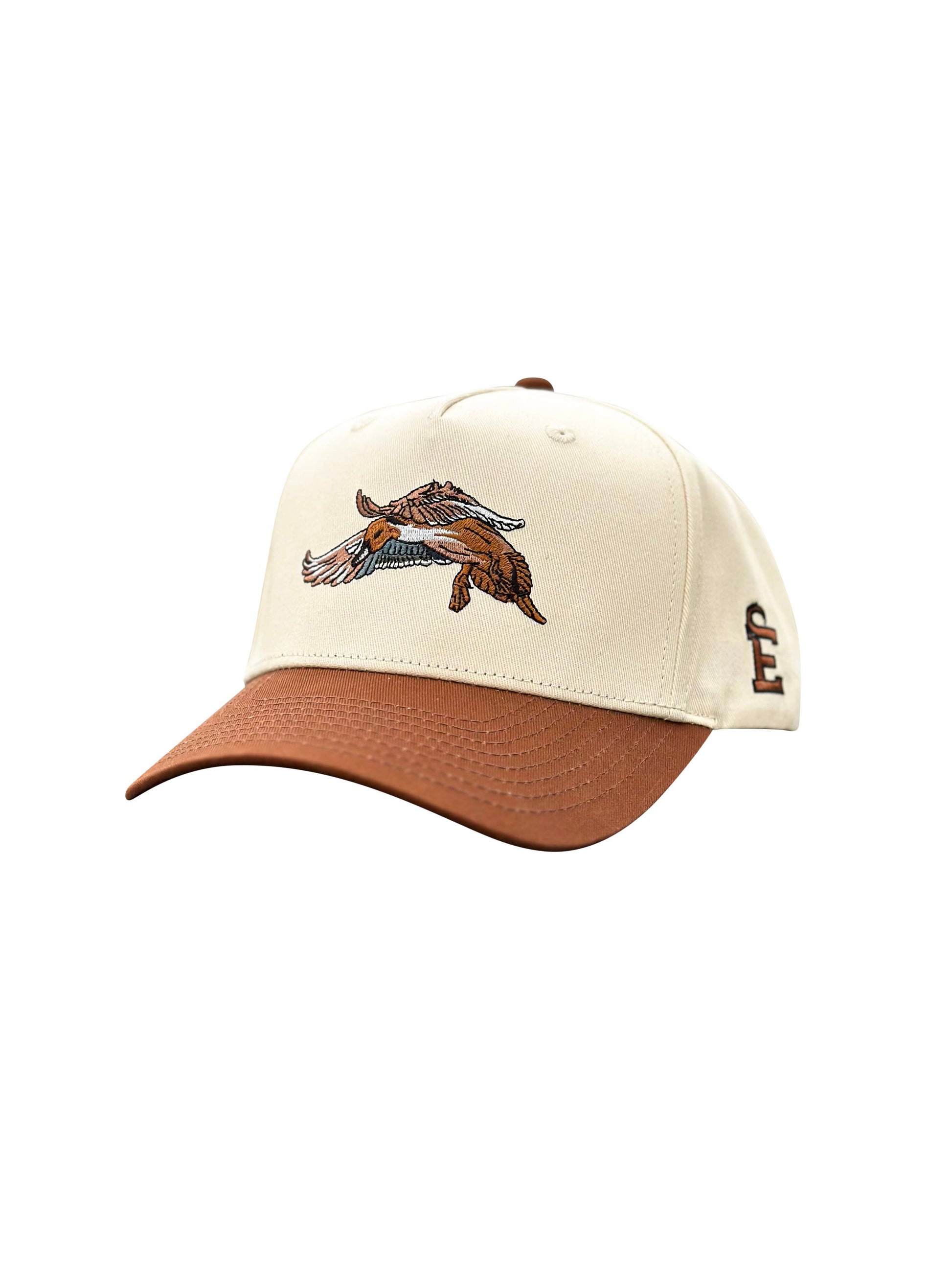 Our newest Pintail design comes on this cream panel and brown brim 5-panel trucker. great for any occasion!