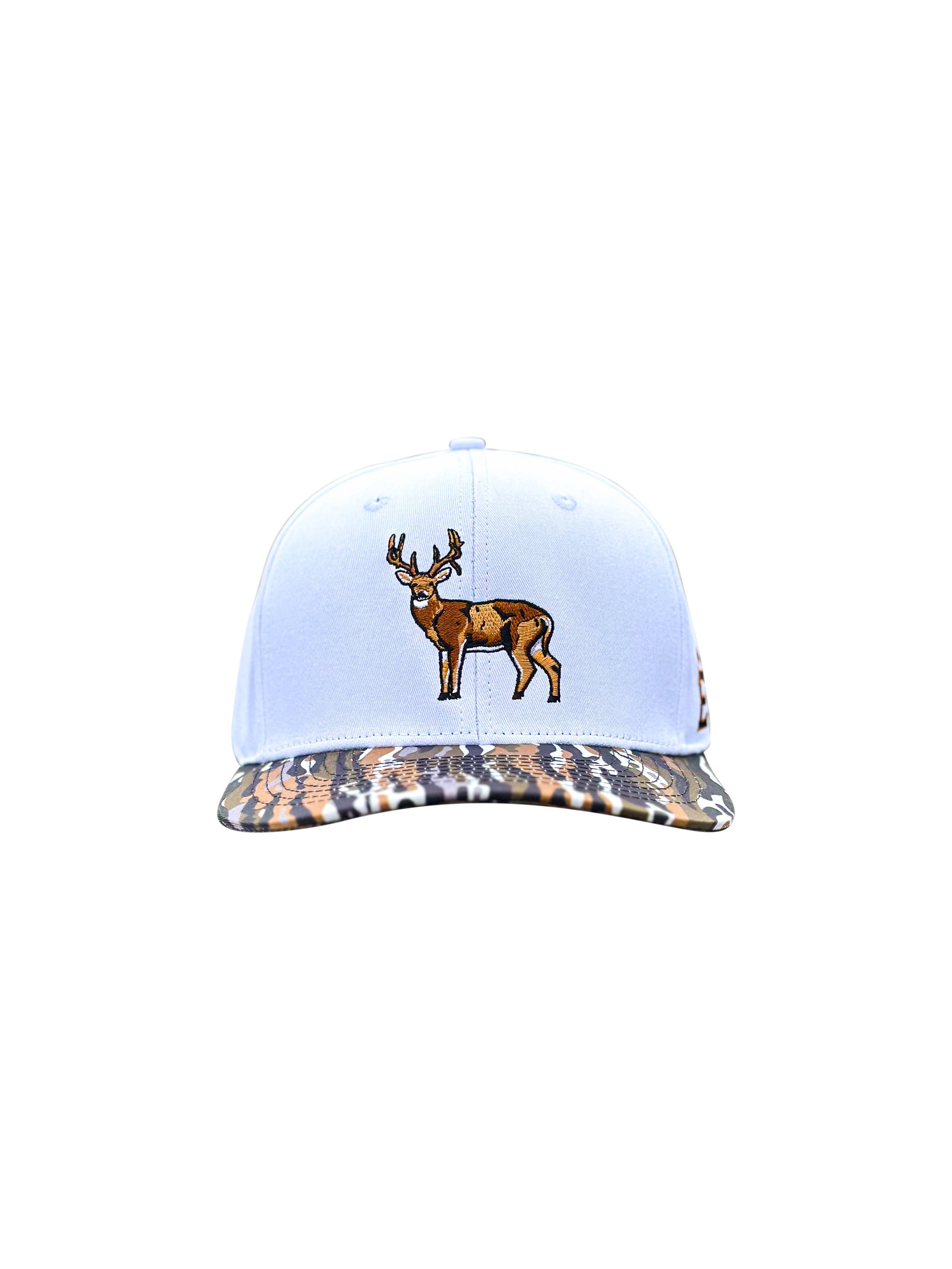 A 6-panel trucker high-profile hat that features our very own "Ranch" camo on the bill, all around white panels to match the camo, and our "Buck" design!